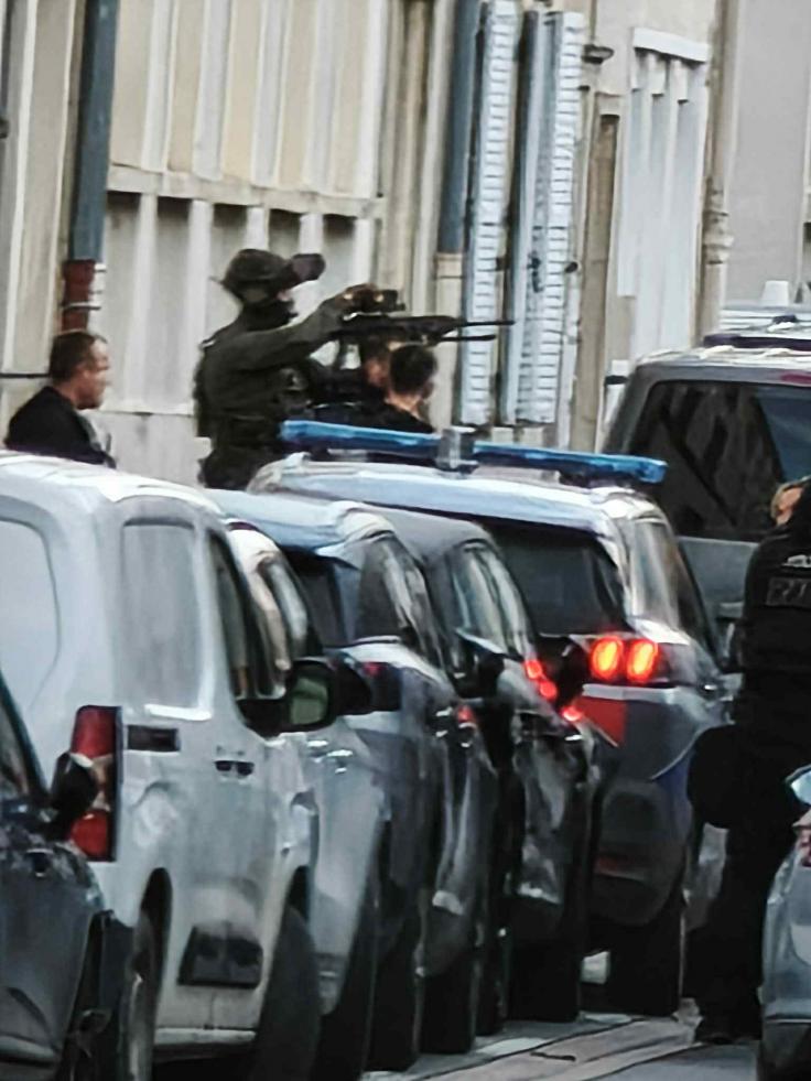 Vers 9 h 30, une dizaine de fourgons noirs et de véhicules de la police nationale s’engouffraient dans la rue. Cette dernière était alors bouclée sur une dizaine de mètres, de l’intersection avec les rues d’Espence et Baudelot à l’angle avec la rue du Grenier-à-sel. Plusieurs membres de l’unité d’intervention spécialisée de la police nationale se plaçaient alors en position de tir au milieu de la rue.