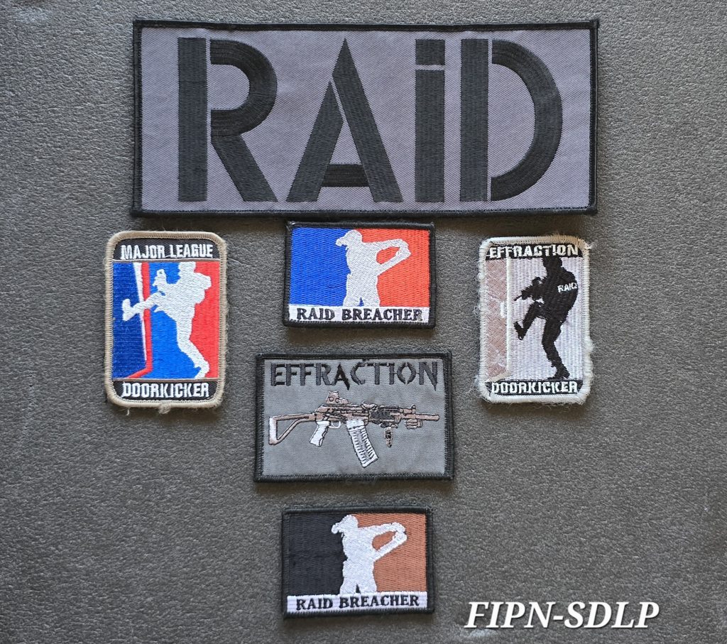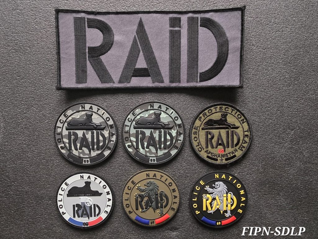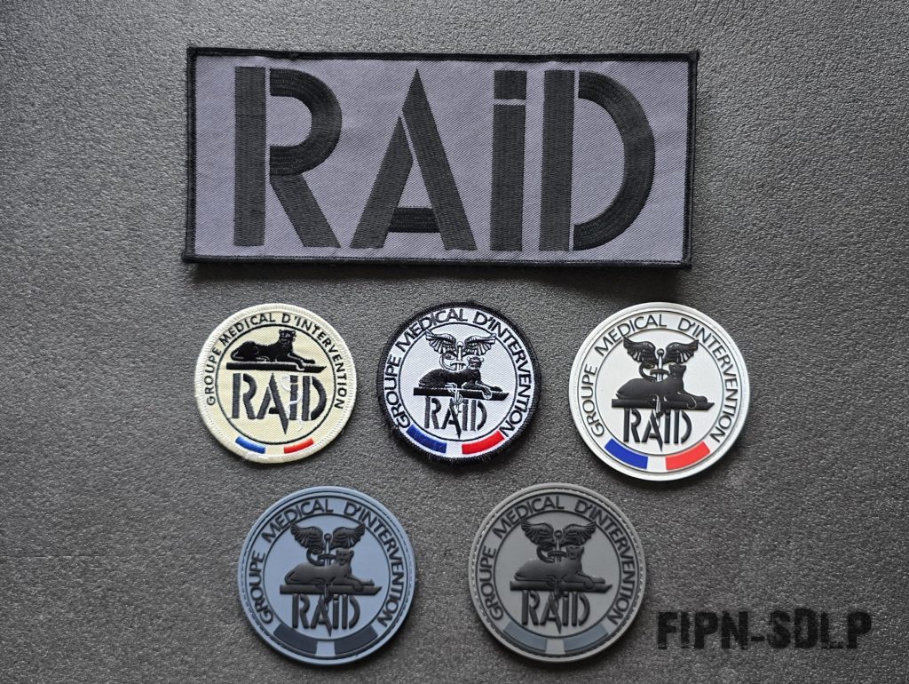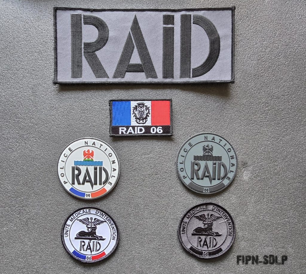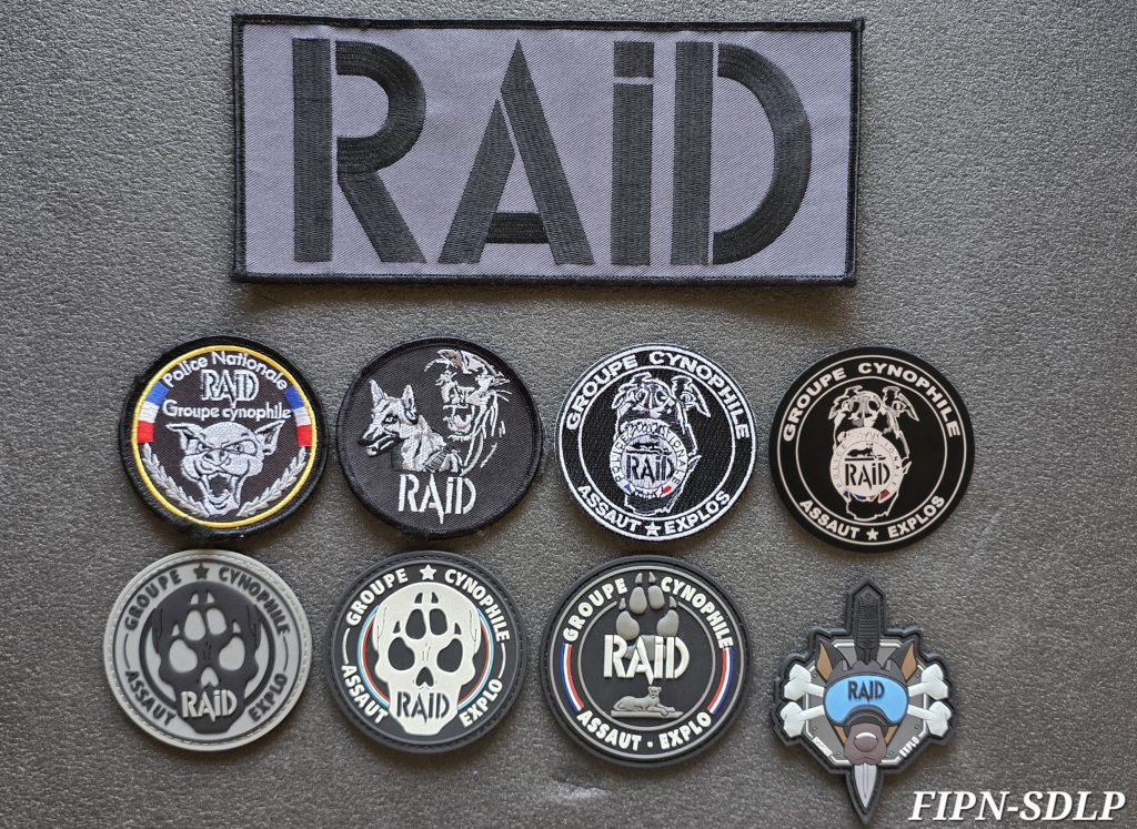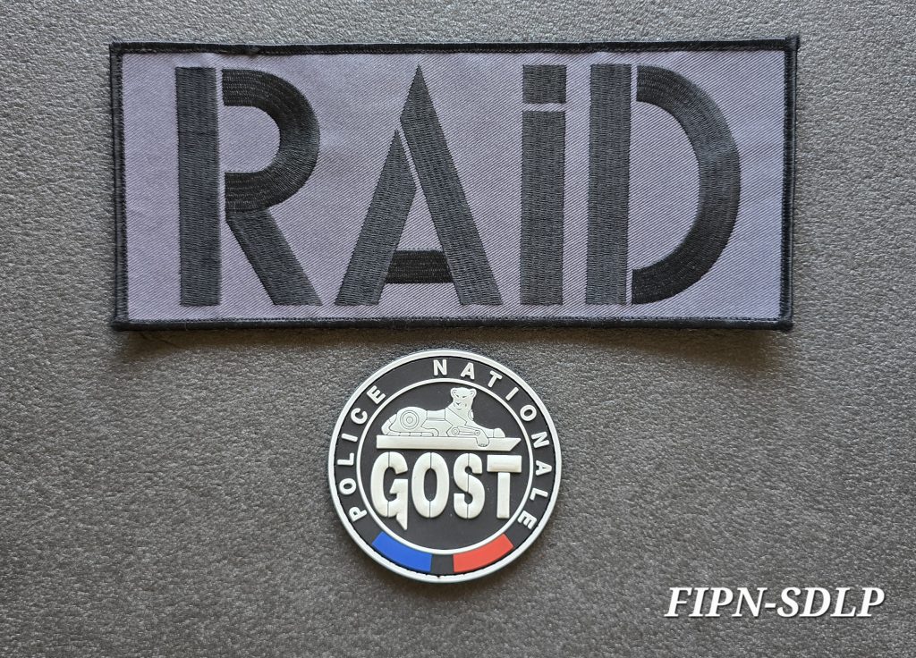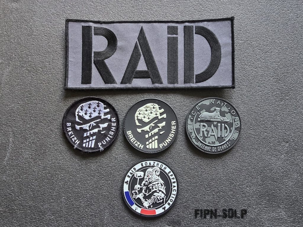 Écussons du service : blanc, basse visibilité (BV), PVC et sable . Patchs FIPN, bande dorsale RAID, deux signalitiques (pvc et tissu)