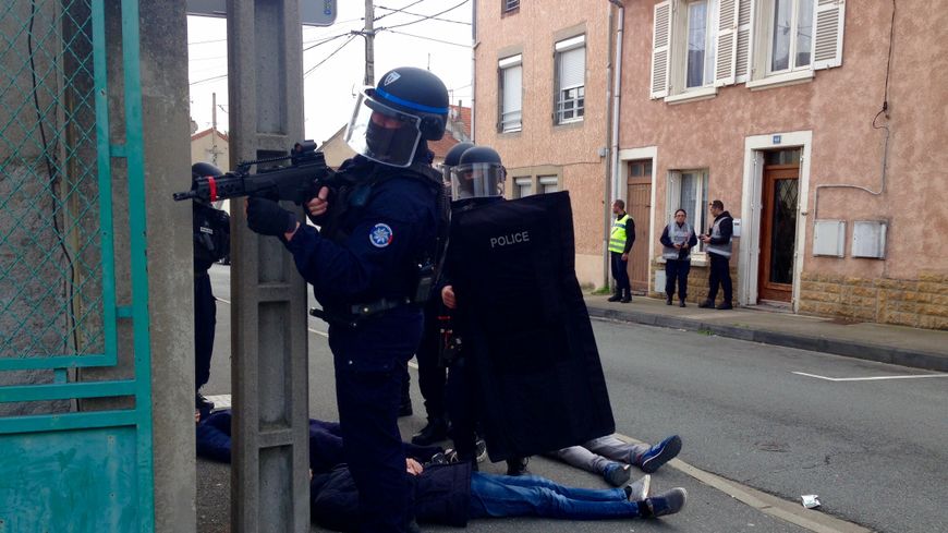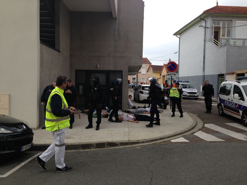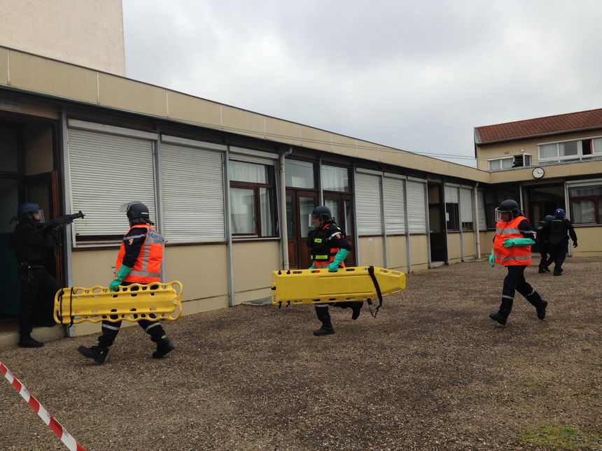 Pour l’exercice de tuerie de masse au lycée Arago de Roanne, on comptait une quarantaine de pompiers et le Samu, des dizaines de policiers et des gendarmes qui surveillaient le quartier et ceux qui sont intervenus directement dans le lycée Arago. Ils sont les premiers à arriver sur les lieux. Ils sont suivis des policiers de la BAC (Brigade Anti-Criminalité) et le RAID (Recherche assistance intervention dissuasion), qui eux tentent d’abattre les terroristes et assurent la sécurité des blessés.