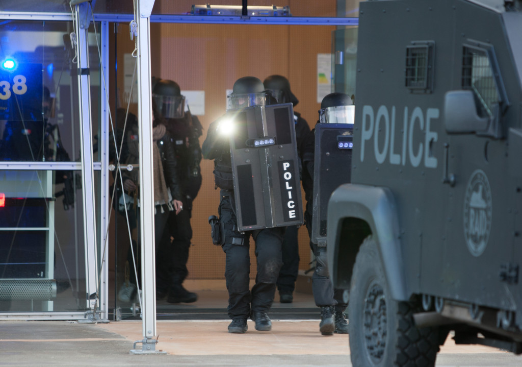 Rien de tout cela. Pour les besoins des médias, cette séquence d’intervention est reproduite à la quasi-identique. La seule différence est qu’un pétard explose lors du transfert de la « personnalité », soit sur une distance d’une dizaine de mètre entre le stade et le blindé. Au même moment, la simulation qui se déroule à l’intérieur du Stadium démarre et reproduit une fusillade avec une prise d’otages. Un scénario qui n’est ouvert à la presse pour des « raisons de confidentialité ». Ainsi s’achève la séquence avec le RAID.