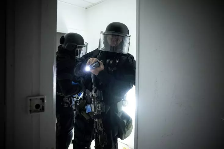 « Allez, changez vous! On se prépare », lance Jonathan tandis que ses hommes s’équipent. En intervention, un opérateur du RAID, polyvalent et hautement entraîné, peut porter plus de 30 kilos d’équipement entre armes, gilets pare-balles, casques et masques, adaptés selon le niveau de menace attendu. « On n’y va pas la fleur au fusil, on prend son temps », intime-t-il.