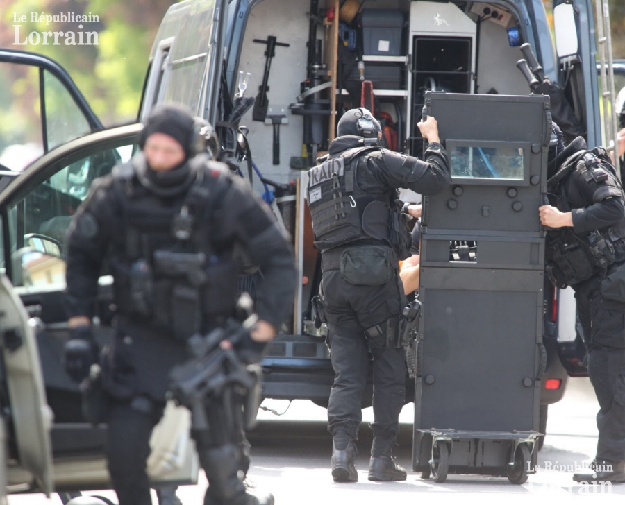 Tous les regards sont braqués sur eux. Le tronçon de rue est désert et bon nombre de riverains tentent vainement d’immortaliser la scène avec leur smartphone. « Ça fait bizarre de voir une scène pareille à Woippy, s’étonne une habitante. Ils sont impressionnants les hommes du Raid en noir avec leurs armes et leurs boucliers. On se croirait presque dans un épisode d’une série télé. L’un d’eux m’a demandé une gamelle d’eau pour son chien. »